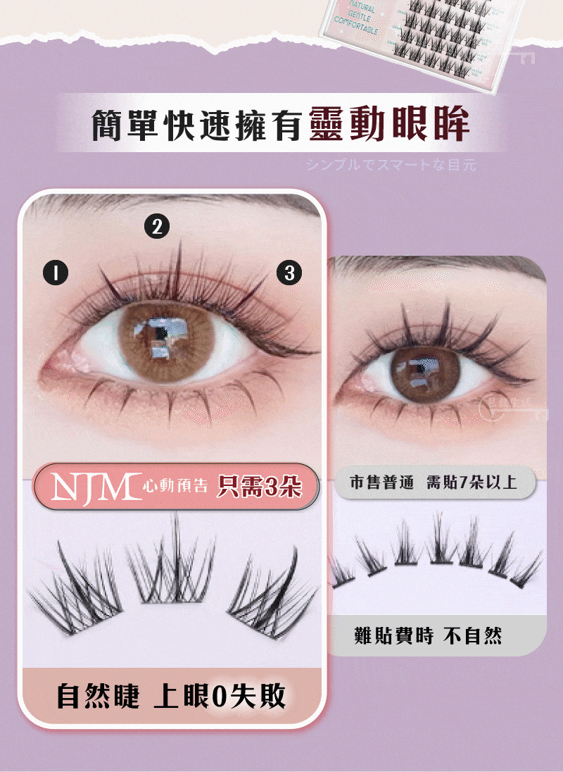 20分鐘前【限時買一送一】日本爆款吸睛NJM懶人睫毛,一秒粘貼 輕盈超細梗 自然不做作~轉為亞洲人眼型設計,上班 / 上學 / 約會 快速上妝秒出門 - 【超值組合 買二送二】NJM懶人假睫毛四入組(一秒粘貼 輕盈超細梗 自然不做作)-NT$ 990
