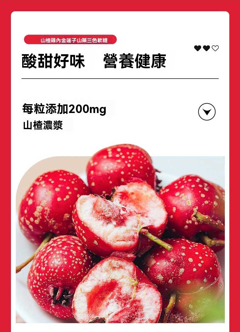 半小時前【山楂雞內金軟糖】開胃、健脾、消食,無蔗糖,純天然藥食同源,增進孩子胃口,增強消化,促進營養吸收 - 【開胃健脾 促進脾胃功能】買三送四 7入組 NT$1398