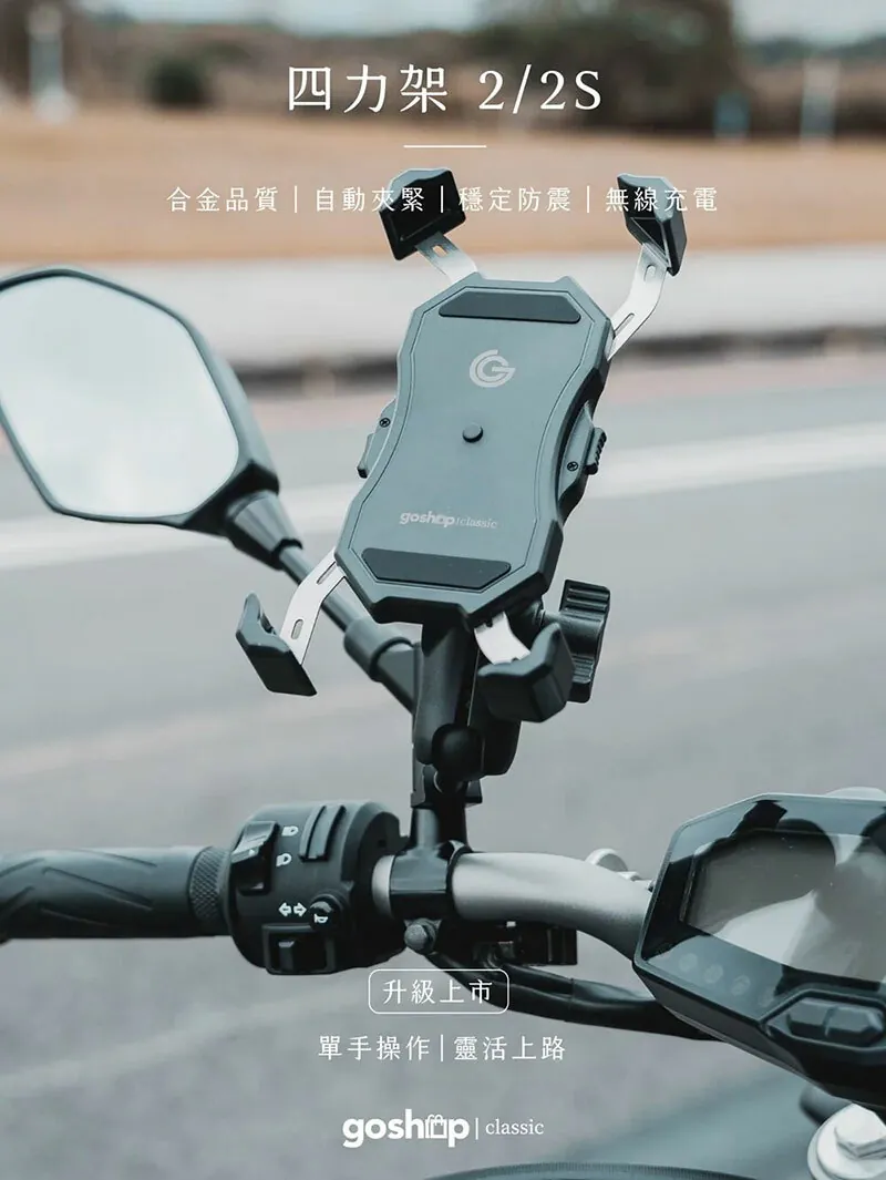 7分鐘前GC 四力架2 / 2s 單手操作 快人一步 最新四力架2 Pro 自動夾緊 USB充電 無線充電兩用機車手機架 外送必備 接單神器 - 四力架2s(通用快充版)一入組NT$1,080