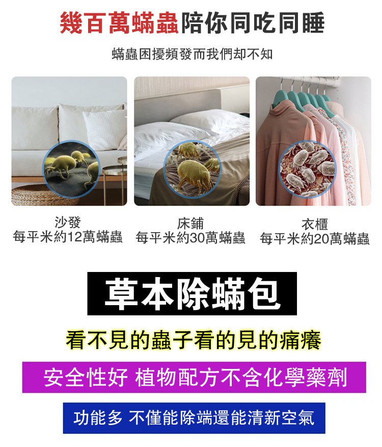 25分鐘前草本除蟎包「春夏季節」蟎蟲細菌容易滋生繁殖快,有了這款除草本除蟎包,在也不用擔心了!! - 「買三送七」十入組NT$1399(均價低至$139/盒)共100小包