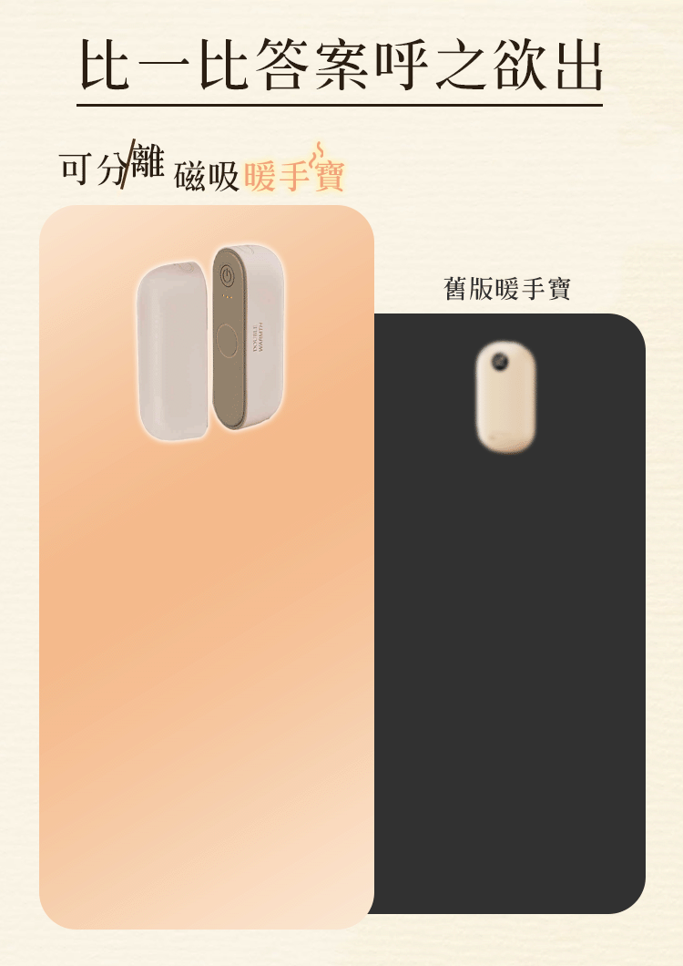 7分鐘前【口碑爆棚!冬天禦寒神器!!】磁吸暖手寶! 外套再厚手還是很冷!暖手過冬就靠它!!! 3秒瞬熱,迅速溫暖你的雙手!! 3檔調溫設計,隨心調你想要的溫度!! 磁吸組合設計,左右手分開使用不怕冷!! - 買一送一暖手寶 『2入組』僅需-NT$1088 均價NT$544