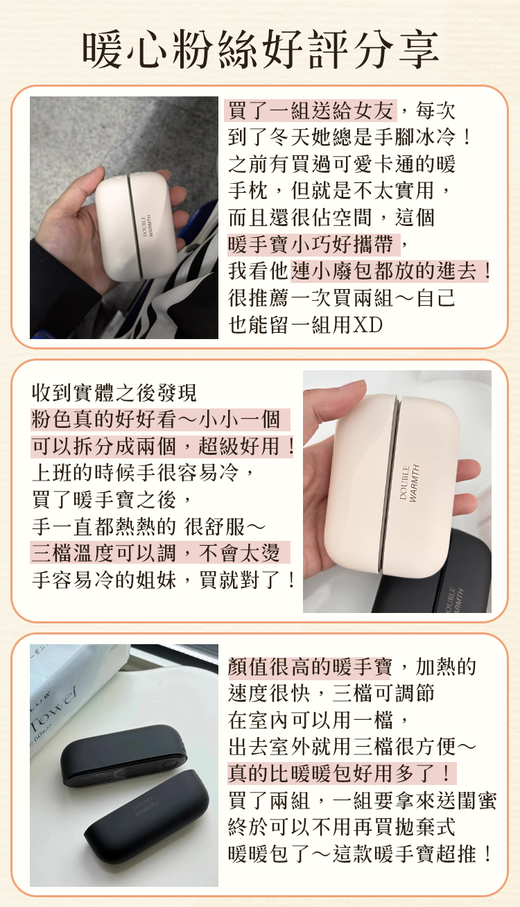 12分鐘前【口碑爆棚!冬天禦寒神器!!】磁吸暖手寶! 外套再厚手還是很冷!暖手過冬就靠它!!! 3秒瞬熱,迅速溫暖你的雙手!! 3檔調溫設計,隨心調你想要的溫度!! 磁吸組合設計,左右手分開使用不怕冷!! - 買二送二暖手寶 『4入組』僅需-NT$1488 均價NT$372